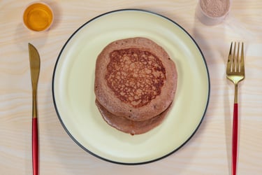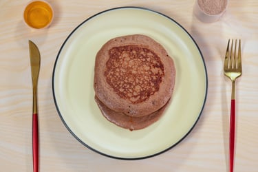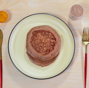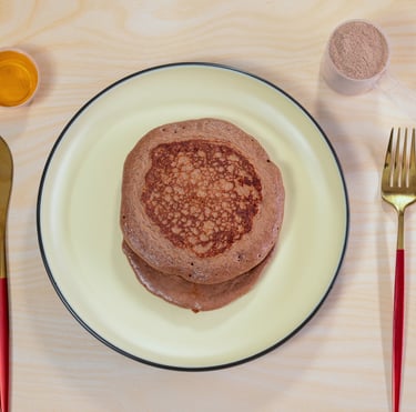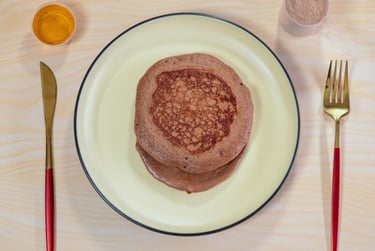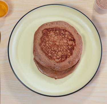 High Protein double chocolate pancake, topped with drizzle of honey and fresh fruit. Protein : 24gm