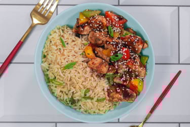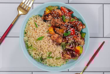 Soft tofu glazed in teriyaki sauce and topped with sesame seeds for the perfect protein snack. Served with brown rice. Protein : 18gm