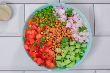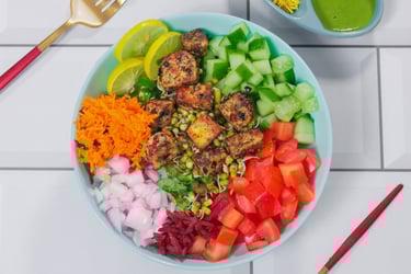 A unique combination of earthy masoor dal & fresh veggies topped with tahini dressing. Protein : 15gm