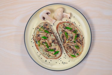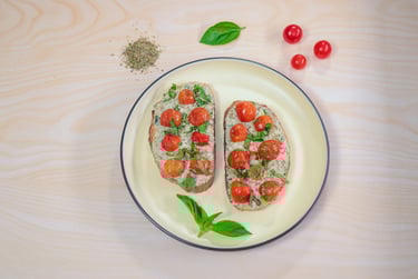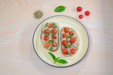 Sourdough bread toast served with a high protein dressing, cherry tomato & basil