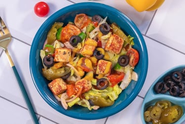 Spicy pan seared Paneer on a bed of lettuce, cherry tomatoes, jalepenos, olives, and other veggies topped with our in-house tangy & spicy dressing. Protein : 22gm