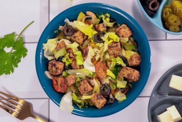 Spicy pan seared Tempeh on a bed of lettuce, cherry tomatoes, jalepenos olives, and other veggies topped with our in-house tangy & spicy dressing. Protein : 22gm
