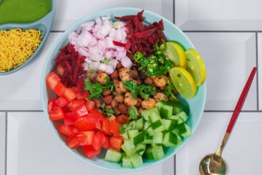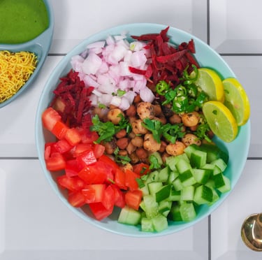 Duo of black & white chickpeas, mixed in with fresh veggies & a tangy chaat dressing. Protein : 15gm
