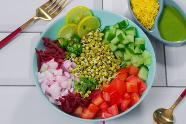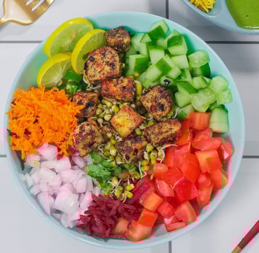 Crumbly pan glazed paneer & perfectly cooked sprouts, mixed in with fresh veggies & a tangy chaat dressing. Protein : 22gm