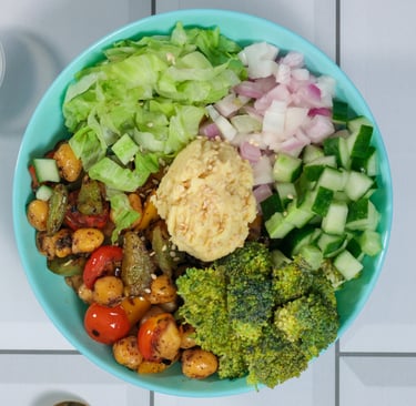 Creamy Hummus served with high protein chickpea salad & A tangy tahini dressing. Protein : 20gm