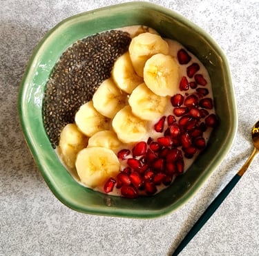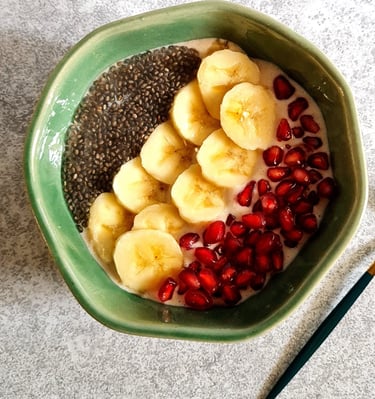 Blend of oats, chia pudding & greek yogurt to make a healthy bowl, drizzled with natural honey and fresh fruits.